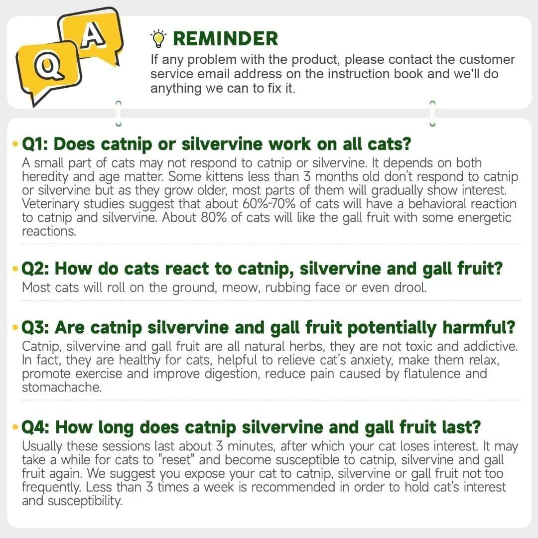 100% Natural and Non-toxic: the catnip balls are made of pure natural plant extracts, no chemical additives contained. Rest assured this toy is no harm to your favorite kitty. Includes 4 different flavors: “catnip”, “silvervine”, “the fruit of silvervine” and "cat energy ball" that conspire to arouse your cat’s interest to lick and play